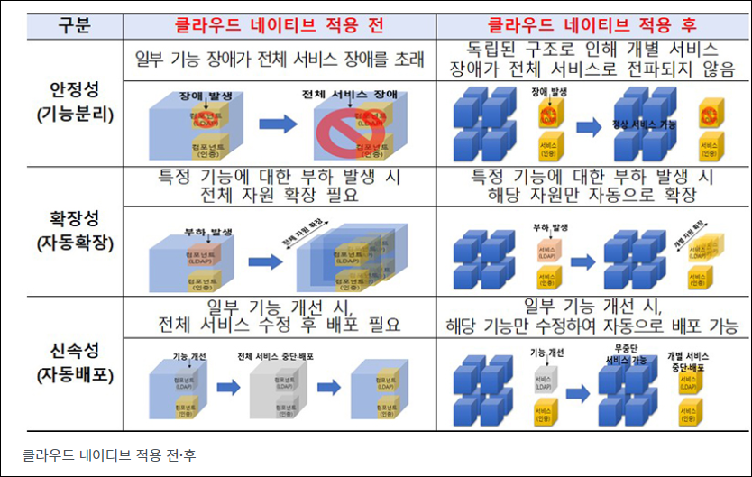 이러한 전환은 현재 사용자 집중으로 인한 접속 지연과 기능 개선 작업으로 인한 서비스 중단 등의 문제를 해결하기 위한 것이다. 예를 들어, 고용산재보험 토털서비스는 매년 120시간의 접속 지연과 1352건의 기능 개선 작업으로 서비스 중단이 발생하는 등 대국민 서비스의 안정성이 중요한데, 클라우드 네이티브로의 전환은 이러한 문제를 해결하고 안정적인 서비스를 제공할 수 있도록 도와준다.