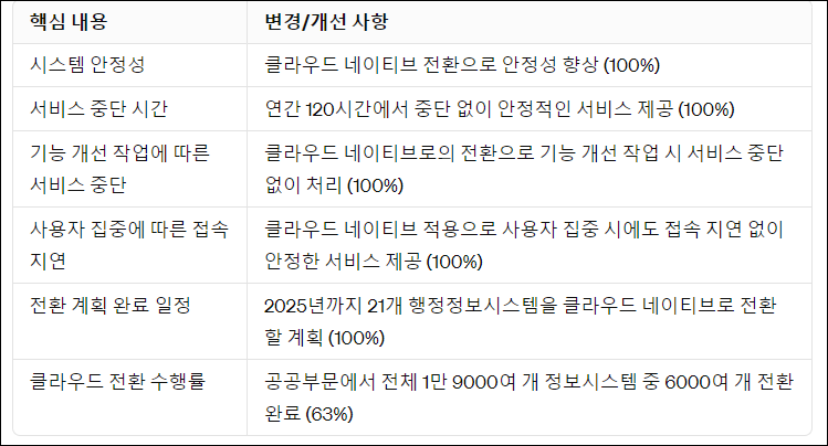 행정안전부는 이러한 전환을 위해 공공부문의 정보시스템을 클라우드 네이티브로 전환하는 프로젝트를 추진 중이다. 기술적인 측면에서는 클라우드 기술을 설계 단계부터 적용하여 안정성과 신속성을 최대한 높이고, 사용자가 갑자기 집중되는 경우에도 서비스의 지연이나 장애가 발생하지 않도록 한다. 또한, 이를 위해 행정부는 컨설팅 사업을 통해 클라우드 네이티브 전환에 필요한 기술적 난도를 극복하고 시스템의 안정성을 보장할 수 있는 기반을 마련하고 있다. 이러한 노력을 통해 2025년까지 21개의 행정정보시스템을 클라우드 네이티브로 전환할 계획이다. 이를 통해 안정적이면서도 신속한 행정 및 공공 서비스를 제공할 수 있도록 노력하고 있다.