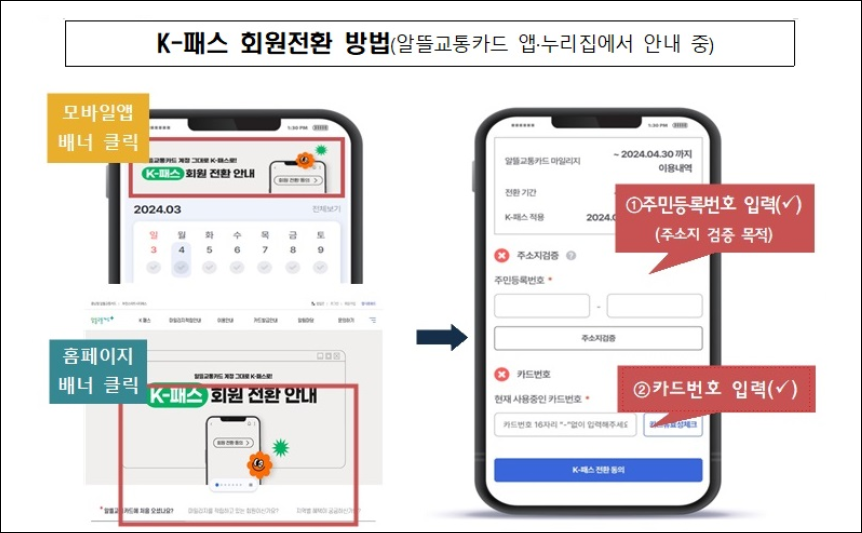 기존 알뜰교통카드 이용자는 간단한 회원 전환 절차만 거치면 K-패스 혜택을 받을 수 있다. 회원 전환은 모바일 애플리케이션(앱) 또는 누리집 웹사이트에서 진행할 수 있으며, 이 과정에서는 현재 사용 중인 알뜰교통카드의 카드번호 입력, 주소지 검증을 위한 주민등록번호 입력, 그리고 이용약관 동의가 필요하다. 이용자들은 다음 달 30일까지 전환을 완료하면 5월 1일부터 즉시 K-패스 혜택을 받을 수 있으며, 전환을 완료하지 않은 경우에는 혜택을 받을 수 없다. 또한, 국토부는 K-패스의 BI와 홈페이지 및 앱 디자인을 공개하여 사용자들에게 시스템의 투명성과 신뢰성을 제공하고 있다.