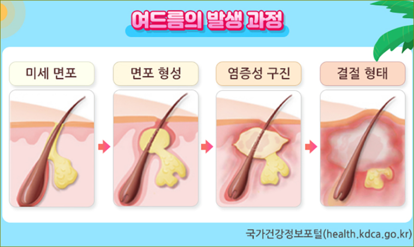 | 여드름 | 피지 분비가 증가하고 모낭이 막히면서 발생하며, 특히 얼굴, 가슴, 등에 염증성 여드름이 생길 수 있습니다. 기온이 높고 습도가 높은 여름에는 여드름이 악화될 수 있습니다. |