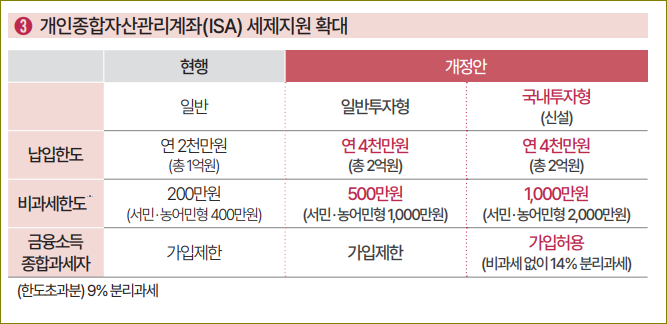 | - 연금저축 + 퇴직연금: 연간 1,800만 원 (변동 없음) - 추가납입 가능 항목: - ISA계좌 만기 시 연금계좌 전환금액 - 1주택 고령 가구(부부 중 1명 60세 이상)의 주택 다운사이징 차액 (생애누적 최대 1억 원) - 기초연금수급자가 10년 이상 장기보유한 부동산(주택, 토지, 건물) 양도차액 |