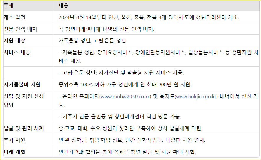 2024년 8월 14일부터 인천, 울산, 충북, 전북 4개 광역시와 도에 새롭게 개소하는 청년미래센터는 가족돌봄과 고립·은둔 청년을 위한 전문 지원 서비스를 본격적으로 시작합니다. 청년미래센터는 지역 사회에서 가족돌봄 및 고립·은둔 청년을 전담으로 지원하는 기관으로, 전문 인력을 활용해 도움이 필요한 청년을 발굴하고 안정적으로 자립할 때까지 밀착 관리할 계획입니다. 각 센터에는 14명의 전문 인력이 배치되며, 이들은 중·고등학교, 대학, 주요 병원 등과 핫라인을 구축하여 가족돌봄청년을 상시 발굴하고, 각종 서비스와 지원을 제공할 것입니다.