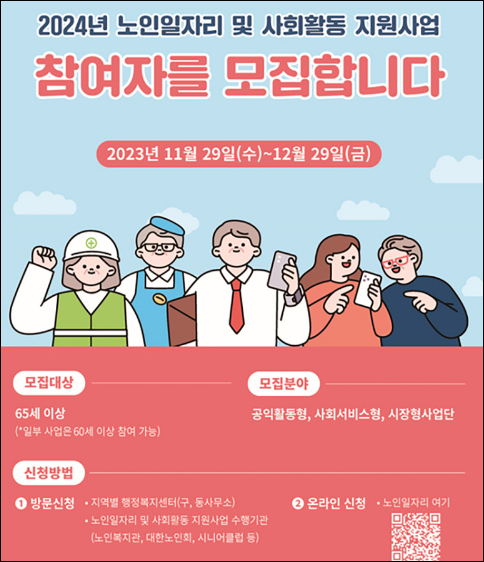 - 2024년 노인일자리 사업은 11월 29일(수)부터 12월 29일(금)까지 참여자를 모집합니다.