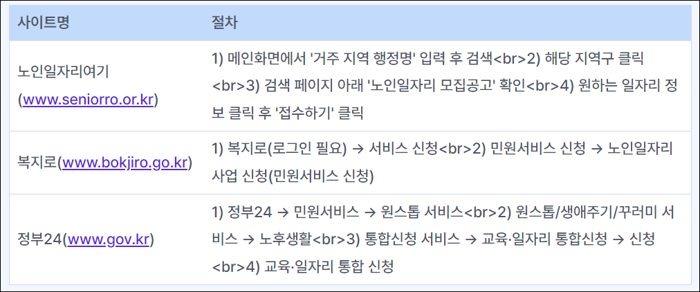 - 방문 신청은 지역의 행정복지센터, 노인복지관, 대한노인회, 시니어클럽 등에서 가능하며, 온라인 신청은 "노인일자리 여기(www.seniorro.or.kr)", "복지로(www.bokjiro.go.kr)", "정부 24(www.gov.kr)"에서 접속하여 신청할 수 있습니다.