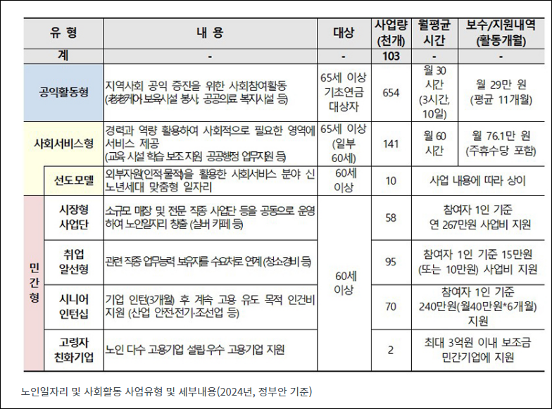 | 규모 및 예산 | 2024년에는 103만 개의 노인일자리가 제공될 예정이며, 이를 위해 2조 262억 원의 예산이 할당됩니다. 이는 노인일자리의 수와 예산이 지속적으로 증가한 결과입니다. |