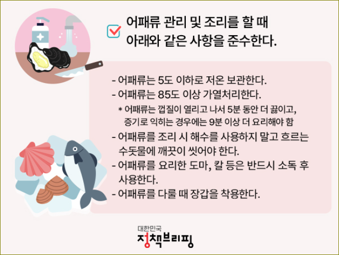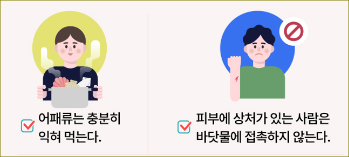 2. 예방을 위한 조치: - 어패류 충분히 익히기: 비브리오균을 죽이기 위해 어패류를 85°C 이상의 내부 온도로 충분히 요리한다. - 오염된 물과의 접촉 피하기: 상처가 있는 경우에는 바닷물에 접촉하지 않도록 주의한다. - 어패류 처리 및 조리의 안전: 어패류를 다룰 때에는 깨끗한 환경을 유지하고 적절한 위생 관리를 실시한다. 또한, 다른 식품과의 교차 오염을 방지하기 위해 적절한 위생 관리를 실시한다.