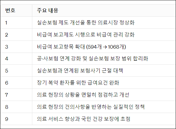 정부는 왜곡된 의료시장을 정상화하고 불필요한 의료이용을 방지하고자 합니다. 실손보험의 증가로 인해 의료이용이 늘어나고 과잉 비급여로 인해 필수의료와 비필수 의료 간 보상이 불공정해지는 문제가 발생했습니다. 이러한 문제를 해결하기 위해 실손보험을 적극 관리하고자 합니다. 또한 환자가 장기 복용 의약품을 보다 원활하게 처방받을 수 있도록 급여요건을 한시적으로 완화함으로써 의료 현장의 상황을 개선하고 국민의 의료기관 이용에 불편을 줄이고자 합니다.