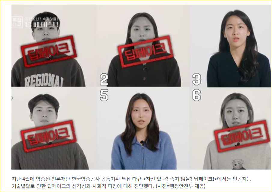 또한, 한국언론진흥재단과 한국방송공사가 공동으로 기획한 특집 다큐멘터리 *<자신 있나? 속지 않을? 딥페이크!>*를 통해 딥페이크 기술이 얼마나 빠르게 발전하고 있는지, 그로 인한 사회적 피해가 얼마나 심각한지 보여주기도 했습니다. 이처럼 딥페이크가 사회적 문제로 자리 잡고 있는 상황에서, 청소년들이 올바른 미디어 리터러시를 갖추는 것은 매우 중요합니다.