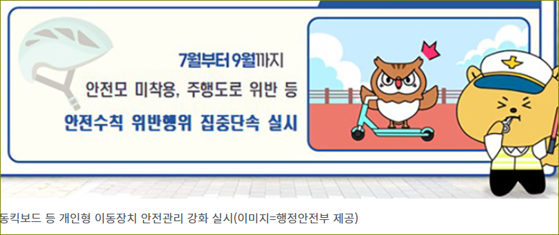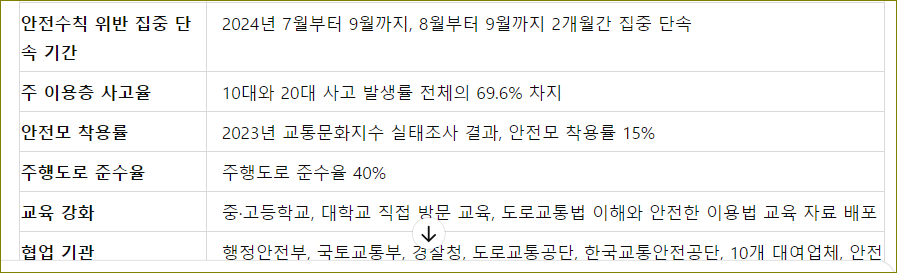 이번 시범 운영과 함께 정부는 개인형 이동장치의 안전수칙 위반 행위에 대해 집중 단속을 실시합니다. 2024년 7월부터 9월까지 안전모 미착용, 무면허 운전, 주행도로 위반, 2인 이상 탑승 등 주요 안전수칙 위반 행위를 경찰청이 중심이 되어 단속합니다.