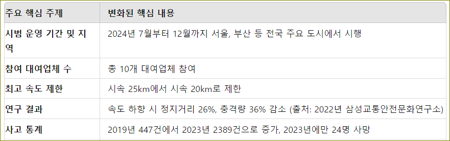 정부는 개인형 이동장치(PMD) 사고 예방을 위해 전국 주요 도시에서 전동킥보드 최고속도를 시속 25km에서 20km로 제한하는 시범 운영을 2024년 7월부터 12월까지 시행합니다. 안전수칙 위반 단속과 이용자 교육을 강화해 사고 및 인명 피해를 줄이는 것이 목표입니다.
