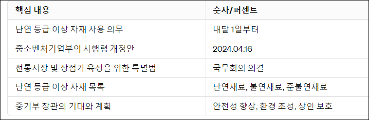 개정된 시행령은 난연 등급 이상의 자재를 사용하도록 의무화하며, 이에 따른 자재 목록은 다양한 화재 방지 재료로 구성되어 있으며, 이를 통해 전통시장의 안전성이 향상될 것으로 기대하고 있으며, 중기부 장관은 앞으로도 안전한 환경을 조성하여 상인들이 안심하고 생업을 영위할 수 있도록 노력할 것을 밝혔다.