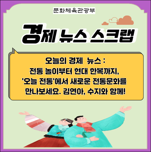 안녕하세요, 여러분. 오늘은 전통문화에 대해 이야기해볼까 합니다. 이번에 서울 중구 문화역서울 284에서 열리는 '오늘전통' 축제에 대해 들어보셨나요? 이곳에서는 우리의 아름다운 전통문화를 현대에 적용한 다양한 전시와 장터, 그리고 전통놀이를 즐길 수 있답니다. 특히, 김연아와 수지가 함께 개발한 현대한복 전시는 꼭 봐야 할 것 같아요. 전통문화는 오래된 것이 아니라, 지금 이 순간에도 계속 새로워지고 있는 것입니다. 그래서 우리는 전통을 이해하고, 존중하며, 새로운 방식으로 표현해나가야 한다고 생각해요. 그런 점에서 '오늘전통' 축제는 전통과 현대가 어우러진 새로운 문화를 창출하는 좋은 예가 아닐까 싶습니다. 여러분도 이번 기회에 '오늘전통' 축제를 방문해 보시고, 전통문화의 새로운 해석을 경험해 보시길 추천드려요.