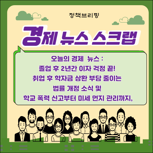 여러분, 오늘은 정말 중요한 소식을 나누고 싶어요. 우리 청년들의 미래에 큰 영향을 줄 수 있는 법률 개정 소식인데요, 바로 취업 후 상환 학자금 대출 이자 면제 대상이 확대된다는 거예요. 이제 기초생활수급자, 차상위 계층, 그리고 다자녀 가구에 속한 대학생들까지도 졸업 후 취업할 때까지 대출 이자 부담에서 벗어날 수 있게 됐어요. 사실 이 소식을 처음 들었을 때, 마음이 참 뭉클했어요. 대학을 다니면서 경제적인 어려움 때문에 많은 친구들이 고민하는 것을 보곤 했거든요. 그런데 이제 그런 고민들이 조금은 더 줄어들 수 있게 되었죠. 이것은 단순히 재정적인 지원의 문제가 아니라, 교육의 기회를 평등하게 만들어주는, 그리고 우리 사회가 조금 더 따뜻해질 수 있는 계기가 되지 않을까 싶어요. 또 하나, 학교 폭력에 대한 대처도 강화된다고 해요. 학교폭력대책심의위원회 회의 결과를 피해학생과 가해학생 양쪽에게 투명하게 공개하고, 무엇보다 조치가 제대로 이행되지 않을 경우 신고할 수 있는 권리가 명확해졌어요. 이것도 큰 진전이라고 생각해요. 그리고 환경의 문제도 잊지 않았어요. 미세먼지 계절관리제 기간을 필요에 따라 연장할 수 있는 법안이 마련되었다니, 우리의 건강뿐만 아니라 환경을 지키는 데에도 한발 더 나아갈 수 있겠죠. 이 모든 변화는 우리가 함께 사는 사회가 한 사람 한 사람의 삶을 어떻게 보듬어 줄 수 있는지를 보여주는 거라고 생각해요. 더 많은 사람들이 이런 변화에 대해 알고, 자신의 삶에 적극적으로 적용할 수 있으면 좋겠어요.