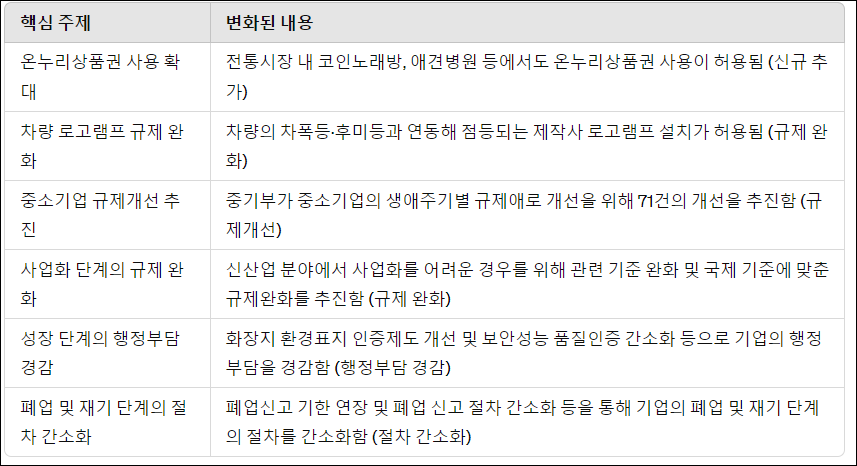 중소벤처기업부가 기업의 생애주기별 규제개선을 위해 71건의 개선을 추진했습니다. 이에 따라 전통시장 내 코인노래방과 애견병원에서도 온누리상품권을 받을 수 있게 됩니다. 또한, 차량의 로고램프 설치 규제가 완화되어 차량의 차폭등이나 후미등과 연동한 로고램프 설치가 허용됩니다.