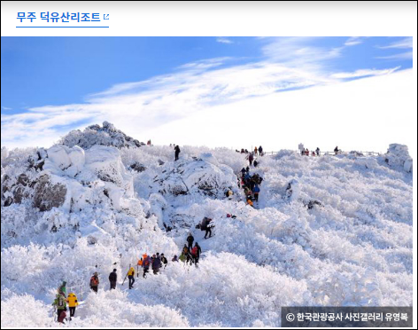 3. 속삭이는자작나무숲: 20년 이상 수령의 자작나무 69만 그루가 숲을 빼곡히 채워 신비한 분위기를 자아냅니다. 4. 무주 덕유산리조트: 해발 1,500m의 설천봉까지 곤돌라를 타고 올라갈 수 있어, 등산 초보자도 쉽게 설산을 만날 수 있습니다.