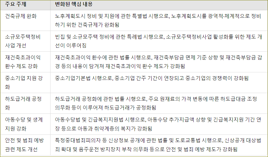 지난 2년간 법제처와 법률 소관 부처가 협력하여 추진한 국정과제 입법계획의 결과로, 총 254건의 법안이 국회를 통과했습니다. 이러한 법안은 국가의 다양한 측면에서의 발전과 취약계층 지원, 경제 활성화, 안전 및 범죄 예방 등을 목적으로 합니다. 주요 내용으로는 건축규제 완화, 중소기업 지원 강화, 하도급거래 공정화, 아동수당 및 생계지원 강화, 안전 및 범죄 예방 관련 제도 개선 등이 있습니다.