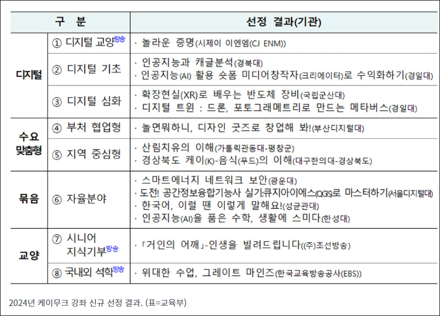 대표적인 평생교육 플랫폼인 케이무크에 총 22개의 신규 강좌가 추가되었다. 이 중 디지털 분야 5개, 수요 맞춤형 강좌 3개, 묶음 강좌 12개, 교양 강좌 2개로 구성되었다.