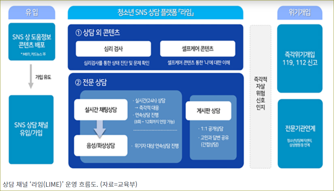 마음 건강을 관리하고 위기 학생을 지원하는 학생 상담 채널 ‘라임(LIME)’이 운영된다. 모바일 기반의 24시간 상담 채널로, 9세부터 24세까지 청소년을 대상으로 전문적인 심리 상담을 지원한다.