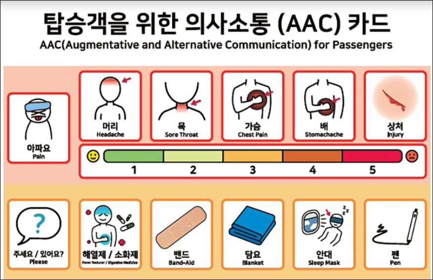 국토부와 국립항공박물관은 청각장애인과 외국인 탑승객들이 자주 요청하는 응급처치 및 기내식 서비스 등 25가지 항목을 그림으로 표현한 의사소통카드를 제작하였다. 이 카드는 다음 달부터 10개 국적사에서 활용될 예정이며, 국토부는 향후 외국 항공사에도 확산할 계획이다. 김영국 국토부 항공정책관은 청각장애인의 직접 참여로 제작된 이 카드가 실효성이 크다고 평가하며, 외항사로의 확산을 계획하고 있다.