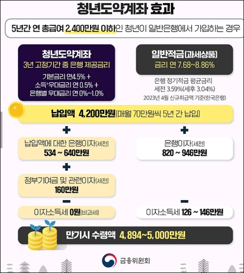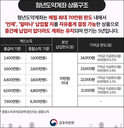 청년도약계좌는 저소득 청년들에게 큰 도움이 될 것 같아요. 개인소득이나 가구소득에 따라 가입이 가능하다는 점, 그리고 매월 최대 70만원까지 자유롭게 납입할 수 있다는 점이 인상적입니다. 또한, 5년 만기시 정부기여금 지원과 이자소득 비과세 혜택이 주어진다는 것도 큰 장점으로 보입니다.