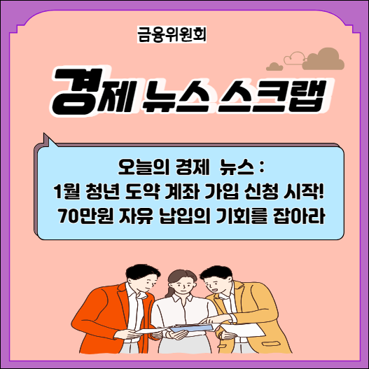 청년도약계좌의 1월 가입신청 기간이 시작되었습니다. 이 계좌는 개인소득과 가구소득 기준에 따라 가입 가능하며, 매월 최대 70만원을 자유롭게 납입할 수 있습니다. 계좌의 만기는 5년이며, 만기시 정부기여금 지원과 이자소득 비과세 혜택이 주어집니다. 청년들의 경제적 도약을 위한 이 기회를 놓치지 마세요.