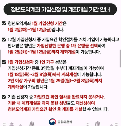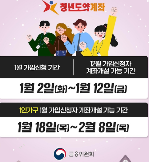 청년도약계좌의 1월 가입신청 기간은 1월 2일부터 1월 12일까지이며, 12월 가입신청자 계좌개설 가능 기간도 동일합니다. 1인가구의 1월 가입신청자 계좌개설 가능 기간은 1월 18일부터 2월 8일까지입니다. 이 계좌는 개인소득과 가구소득 기준에 따라 가입이 가능하며, 매월 최대 70만원을 자유롭게 납입할 수 있습니다. 계좌의 만기는 5년이며, 이때 정부기여금 지원과 이자소득 비과세 혜택이 있습니다.