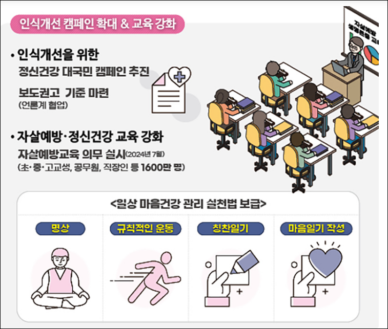 1. 일상적 마음 돌봄 체계 구축: 2년마다 정신건강 검진을 실시하고, 심리상담 서비스를 제공하여 정신질환을 사전에 예방하고 조기에 치료합니다. 또한 자살예방교육을 의무화하여 일반국민 및 서비스 제공자 대상으로 교육을 실시합니다.