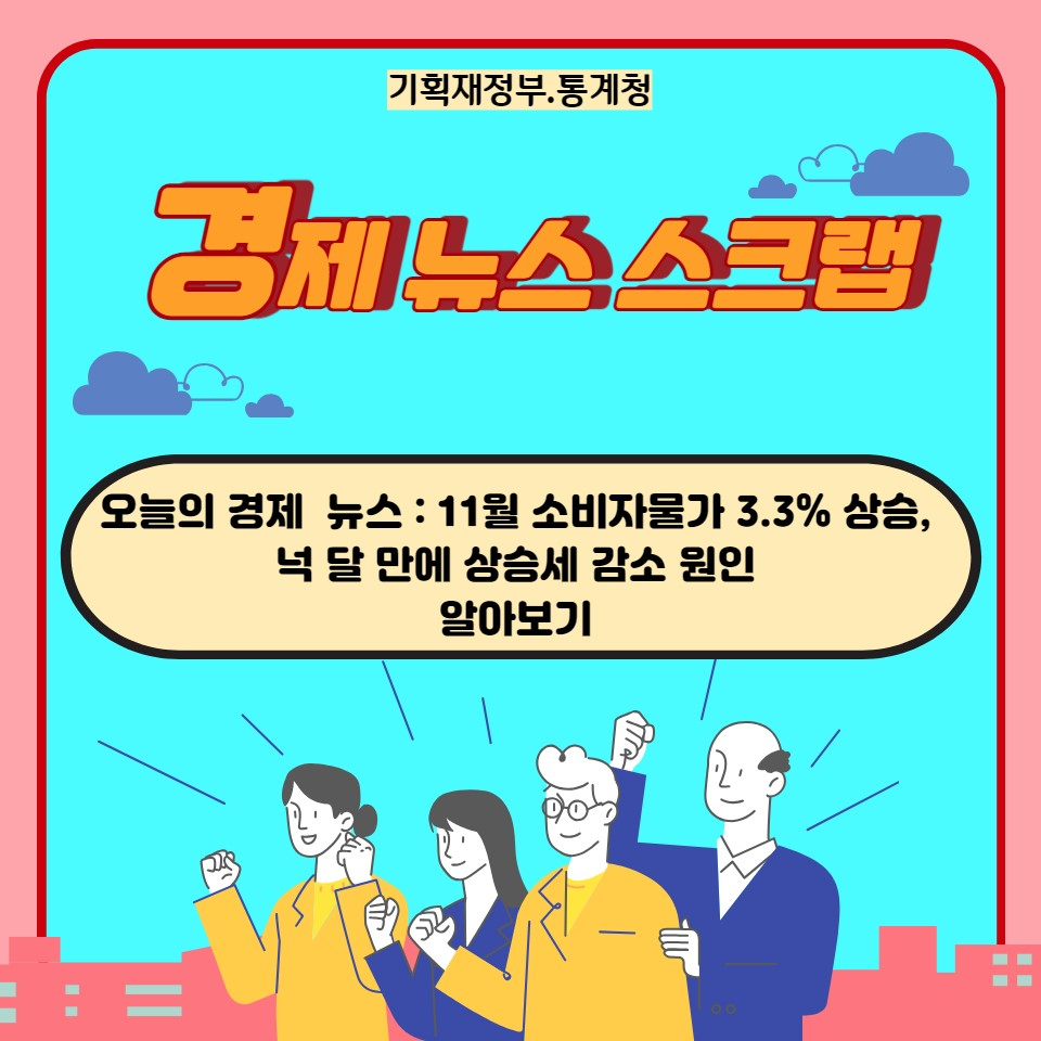 지난 11월 소비자물가가 전년 동월 대비 3.3% 상승하였습니다. 이는 지난 7월 이후 4개월 동안 상승세가 이어졌으나 상승 폭이 감소하였음을 의미합니다. 또한, 농축수산물과 석유류 가격 하락, 그리고 내구재 가격 상승률의 둔화 등이 주요 요인이었습니다.