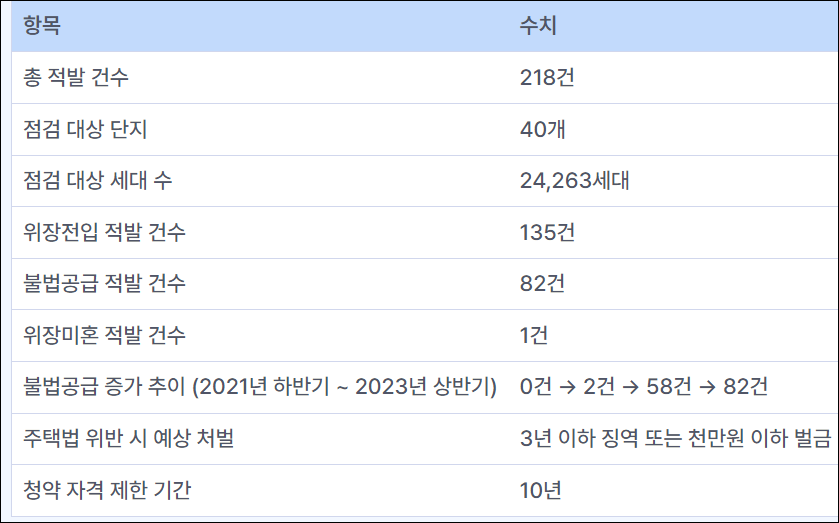 국토교통부는 적발된 218건의 공급질서 교란행위에 대해 경찰에 수사의뢰하였으며, 주택법을 위반한 경우에는 형사처벌과 함께 계약 취소, 주택 환수, 그리고 향후 10년간 주택청약 자격 제한 등의 엄중한 조치를 예정하고 있습니다.
