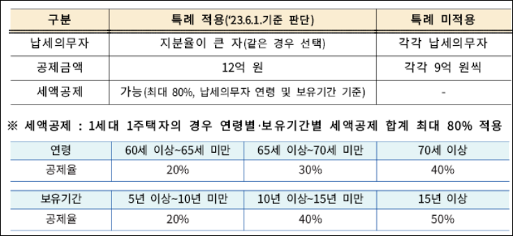 | 기본공제금액 변경 | 개인: 이전 6억 원 → 현재 9억 원, '1가구 1주택자': 이전 11억 원 → 현재12억 원 |