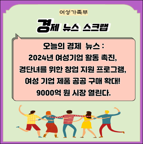 정부가 여성 창업케어프로그램을 여대생에서 경력단절 여성 중심으로 개편하고, 미래 여성경제인 육성사업을 확대하는 계획을 세웠습니다. 중소벤처기업부는 이를 위해 2024년 여성기업 활동 촉진 시행계획을 발표했습니다. 여성기업제품 공공구매 규모는 2023년 11조 3000억 원에서 9000억 원이 늘어나 12조 2000억 원으로 운영될 예정입니다.