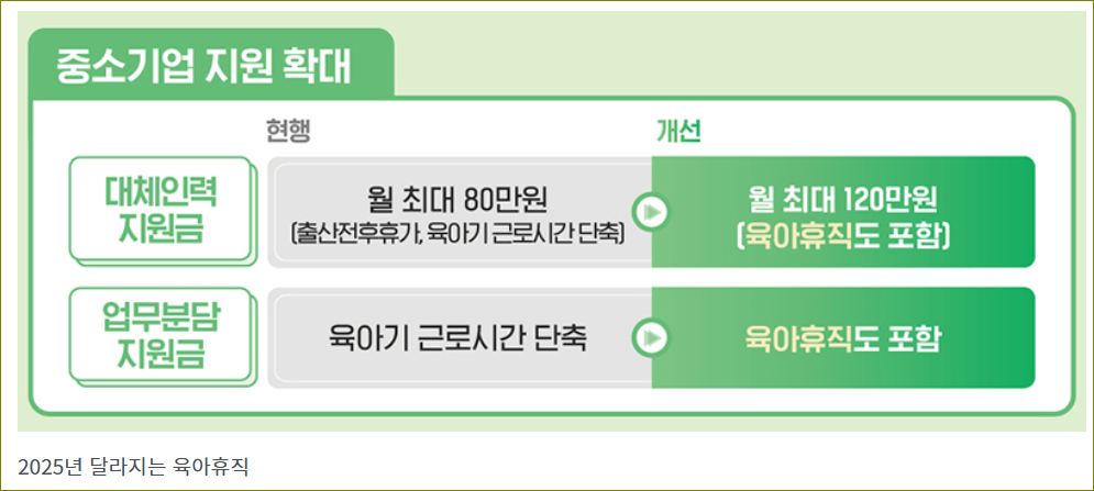 정부는 중소기업에 대한 지원도 확대합니다. 육아휴직을 사용하는 근로자를 대신할 대체인력에 대한 지원금도 기존 월 80만 원에서 120만 원으로 인상됩니다. 또한, 동료의 눈치를 보지 않도록 하기 위해 업무분담 지원금도 확대될 예정이에요. 이를 통해 육아와 일을 병행하는 환경이 더욱 개선될 것으로 기대돼요