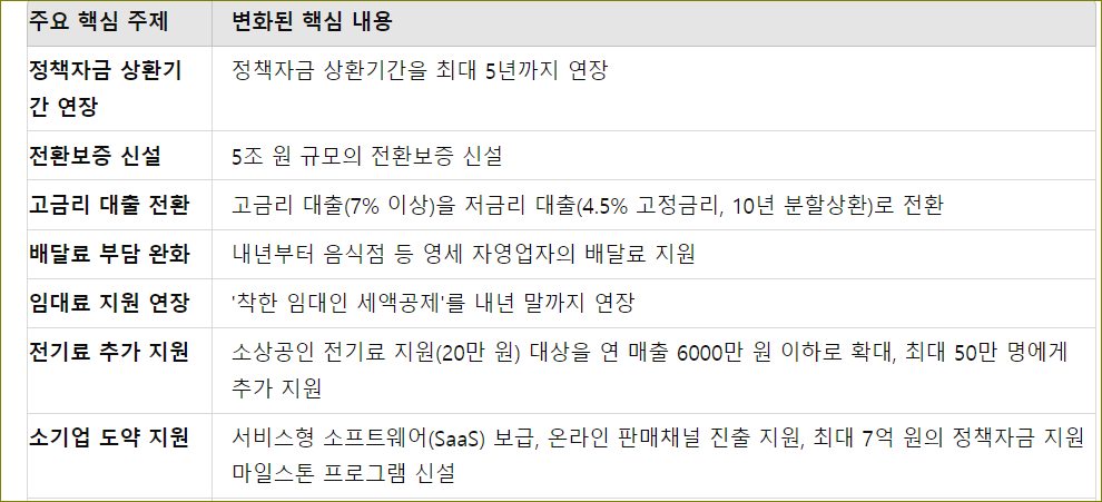 - 경영 애로를 겪고 있는 소상공인들의 정책자금 상환 연장 대상을 대폭 확대하고, 연장 기간을 최대 5년까지 늘립니다. - 지역신용보증재단의 보증부 대출을 이용하는 소상공인이 상환기간을 최대 5년까지 연장할 수 있도록 5조 원 규모의 전환보증을 신설합니다. - 고금리 대출(7% 이상)을 저금리 대출(4.5% 고정금리, 10년 분할상환)로 전환하는 프로그램의 요건을 완화할 계획입니다. |