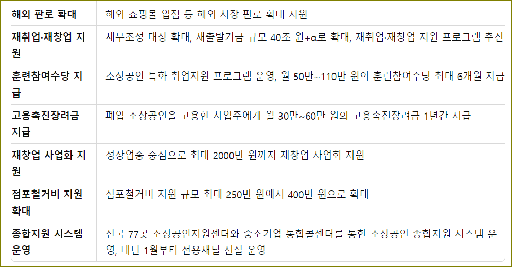 | 4. 재취업·재창업 지원 | - 경영상황이 크게 어려워진 소상공인에게 과감한 채무조정과 함께 재취업·재창업 등 재기를 적극 지원합니다. - 채무조정 대상을 늘리고 새출발기금 규모를 10조 원 늘려 40조 원 이상으로 확대합니다. - 국민취업지원제도, 희망리턴패키지 등과 연계해 소상공인 취업·재창업을 지원하는 새출발 희망 프로젝트를 추진합니다. - 소상공인 특화 취업지원 프로그램을 운영해 월 50만~110만 원의 훈련참여수당을 최대 6개월 지급하고, 폐업 소상공인을 고용한 사업주에게는 고용촉진장려금을 1년 동안 월 30만~60만 원(1명당) 지급합니다. - 성장업종 중심으로 최대 2000만 원까지 재창업 사업화를 지원하고, 점포철거비 지원 규모도 최대 250만 원에서 400만 원으로 확대할 계획입니다. |