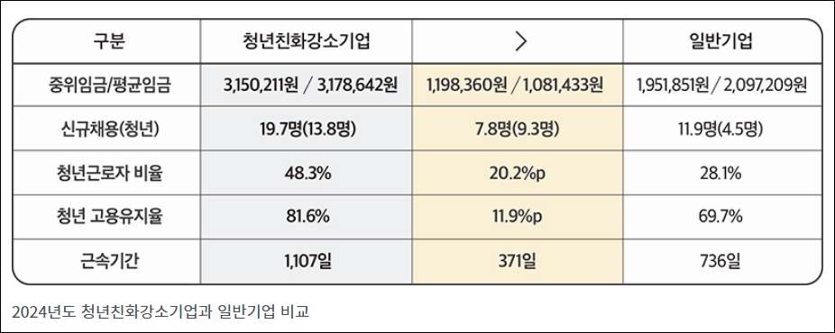 - 고용노동부는 2024년 청년친화강소기업으로 533개 기업을 선정했다고 발표했습니다. 이 기업들은 일반기업보다 높은 임금과 청년 고용율을 기록했으며, 청년 근로자의 고용 유지율도 높게 나타났습니다. 예를 들어, 선정된 기업의 평균 월 중위임금은 315만 원, 평균임금은 317만 9000원으로 일반기업보다 각각 119만 8000원, 108만 1000원 높았습니다. 신규 채용 근로자는 평균 19.7명이며, 청년은 13.8명으로 전체의 70.1%를 차지했습니다. 청년근로자 비율은 평균 48.3%, 청년 고용유지율은 81.6%로 일반기업보다 각각 20.2%p, 11.9%p 높았습니다.