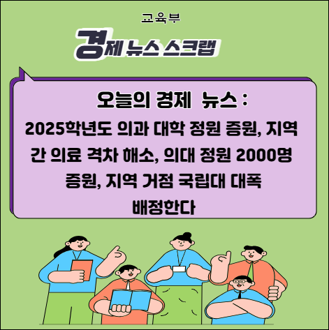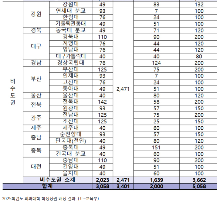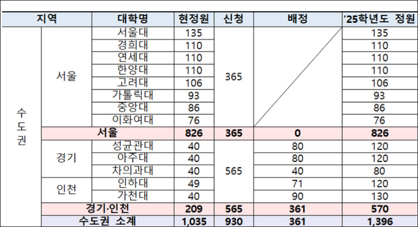 정부가 2025학년도 의과대학 학생 정원을 총 2000명 증원키로 하고 2000명 중 82%에 해당하는 1639명을 비수도권에, 18%에 해당하는 361명을 경인지역에 배정하기로 했다. 특히 서울엔 신규 정원을 배치