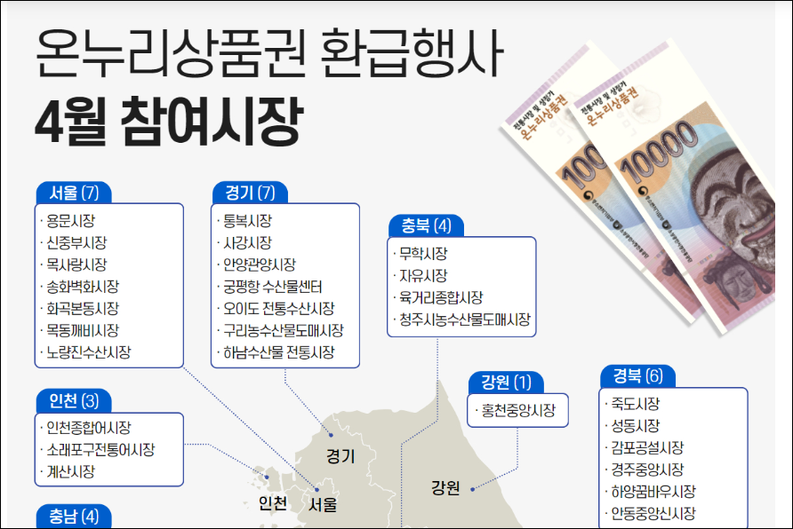 4월에는 대한민국 수산대전과 전통시장 온누리상품권 이벤트가 열립니다. 이벤트를 통해 국내 수산물을 최대 50% 할인받을 수 있으며, 전통시장에서는 구매 시 온누리상품권을 최대 2만 원까지 받을 수 있습니다. 이러한 이벤트는 소비자들에게 수산물 소비를 촉진하고 부담을 덜어주는 데에 도움이 될 것으로 기대됩니다.