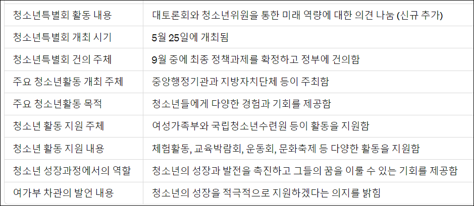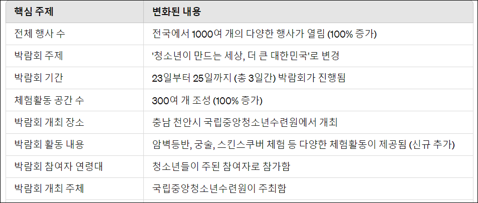 다양한 프로그램과 체험활동을 통해 청소년들에게 창의성, 스포츠, 진로 탐색, 디지털 역량 등 다양한 영역에서의 경험을 제공한다. 청소년박람회와 토론회를 통해 청소년들의 의견을 듣고 미래를 준비하는 데 필요한 역량을 강화한다. 또한, 중앙 및 지방 행정기관, 단체의 협력을 통해 광범위한 행사를 개최하여 청소년들에게 다양한 경험과 기회를 제공한다.