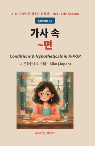 오늘은 일본의 Aiko와 온라인 1:1 수업이에요.Today's one-on-one lesson is with Aiko from Japan.Aiko는 K-POP과 J-POP을 둘 다 좋아하는 학생이에요. 두 언어의 가사를 비교하며 공부하는 걸 즐겨요.Aiko loves both K-POP and J-POP. She enjoys comparing lyrics in both languages to study.수업 전 Aiko가 말했어요.Before class, Aiko said —"선생님, '네가 없으면'이 'If you're not here'예요? ~면이 'if'예요?""Teacher, does '네가 없으면' mean 'If you're not here'? Is ~면 the same as 'if'?"
